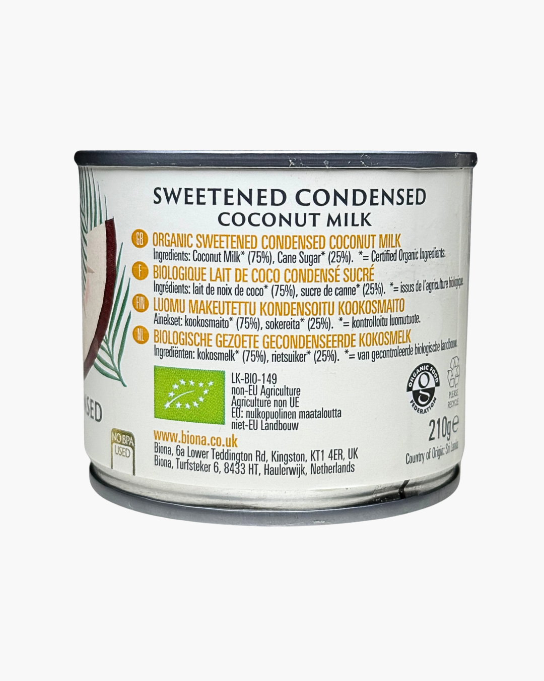Elevate your culinary creations with Biona Organic Sweetened Condensed Coconut Milk 210g. Made from carefully sourced organic coconuts, this creamy, naturally sweet milk provides a rich texture and delicious flavor for desserts, baking, beverages, and cooking.