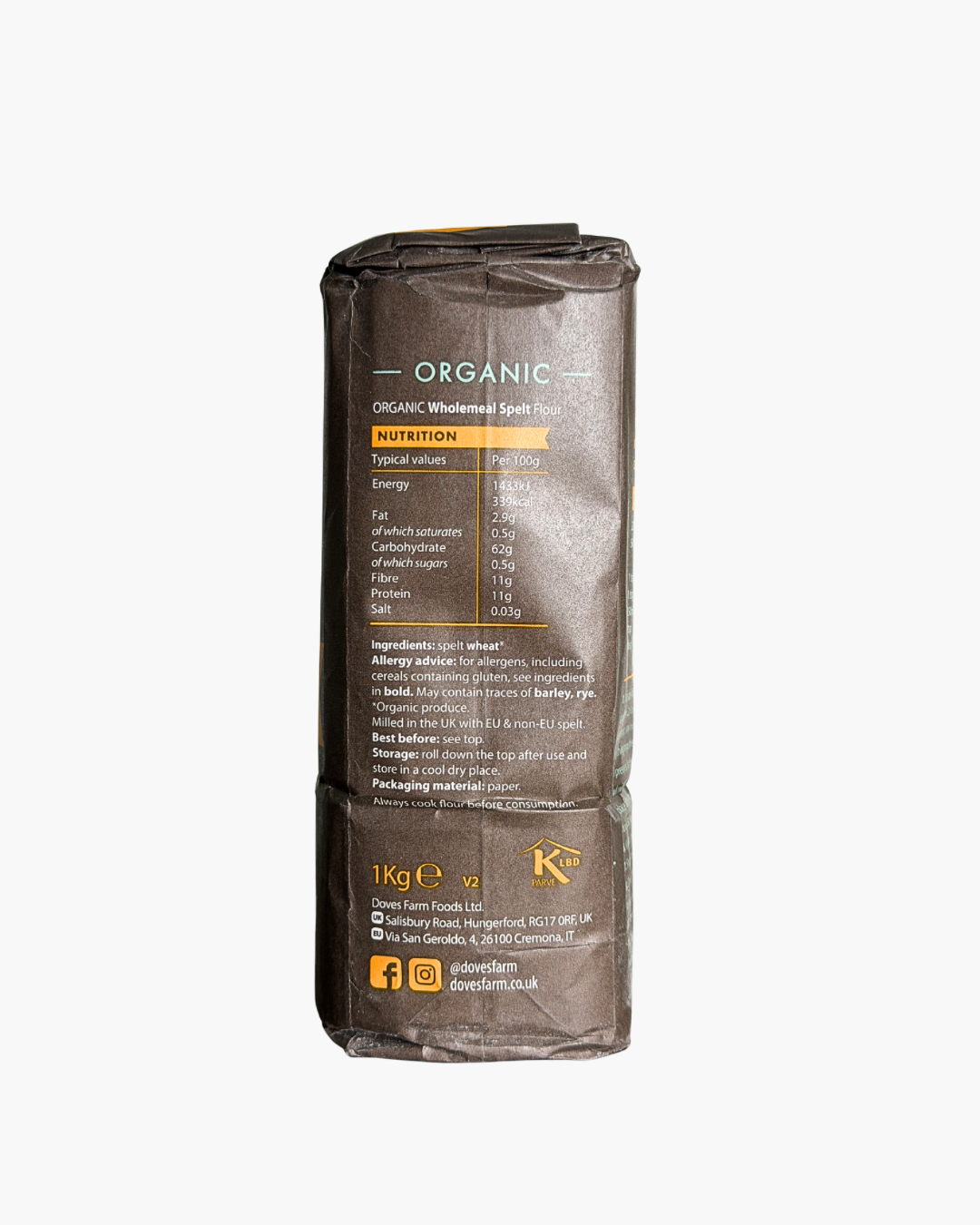 Doves Farm Organic Wholemeal Spelt Flour 1kg is milled from carefully selected organic spelt grain, an ancient grain known for its rich flavour and nutritional value. With its naturally nutty taste and slightly sweet undertone, it’s ideal for baking breads, cakes, biscuits, and pastries.