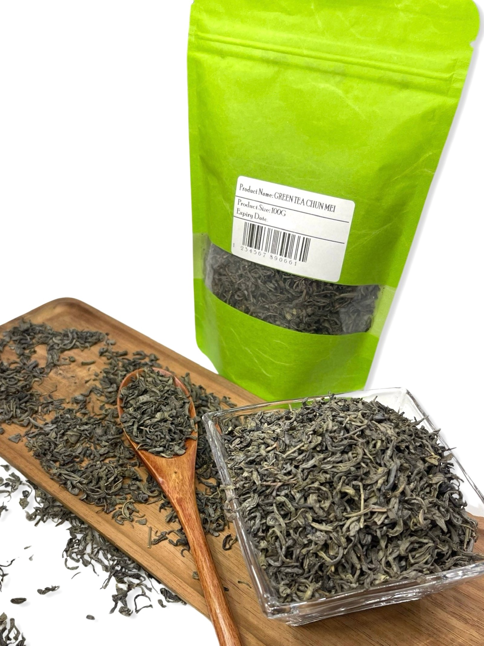 To prepare Green Tea Chun Mei, steep the loose tea leaves in hot water (approximately 175-180°F or 80-82°C) for 2-3 minutes. Adjust the brewing time based on personal preference for strength.
