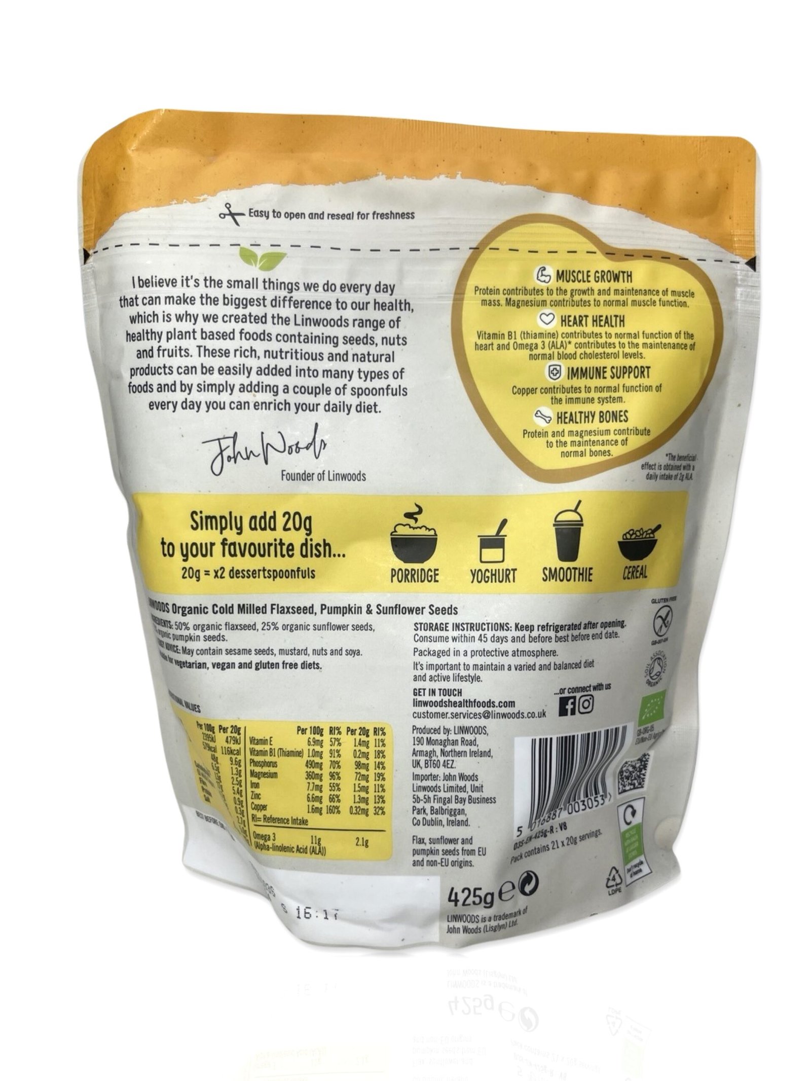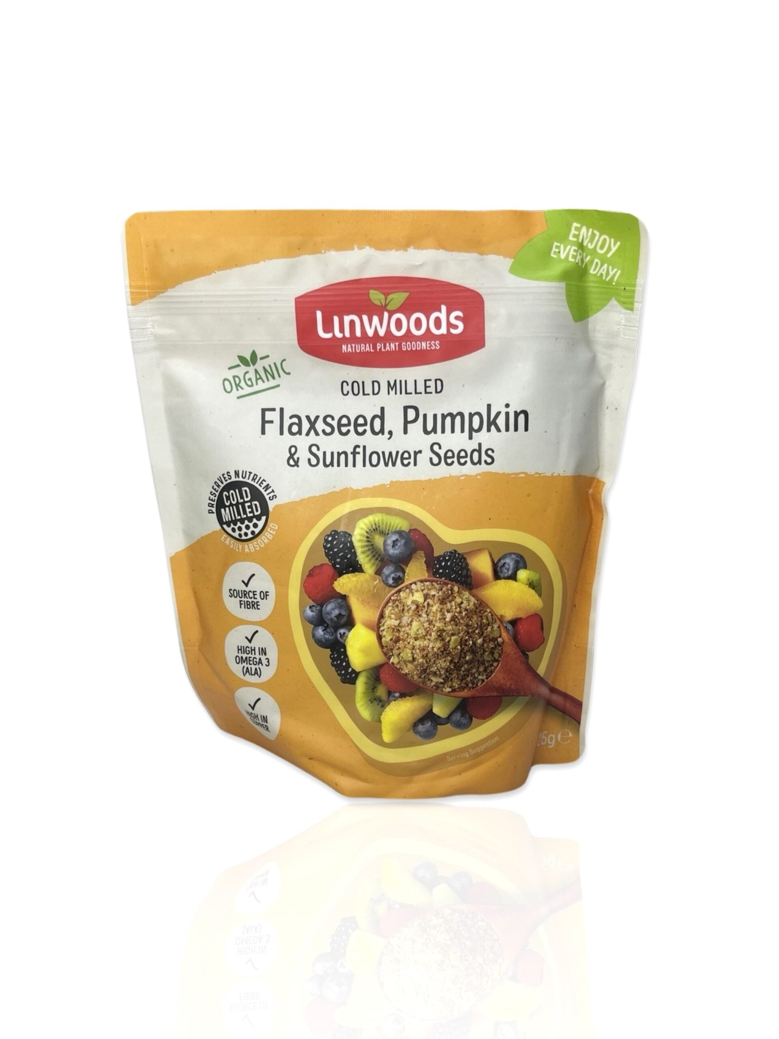 Elevate your meals with the nutritional powerhouse of Linwoods Cold Milled Flaxseed, Pumpkin & Sunflower Seeds, a blend of premium seeds rich in essential nutrients and flavor. Our blend combines the omega-3 fatty acids of flaxseed with the nutty goodness of pumpkin and sunflower seeds, offering a convenient way to boost your daily intake of fiber, protein, vitamins, and minerals. Cold milling ensures that the seeds retain their natural freshness and nutritional integrity, providing maximum health benefits in every spoonful. Sprinkle our seed blend over yogurt, salads, oatmeal, or smoothies for added crunch and nutrition, or use it as a topping for baked goods and savory dishes. With Linwoods Cold Milled Flaxseed, Pumpkin & Sunflower Seeds, you can nourish your body with the goodness of seeds in every meal.