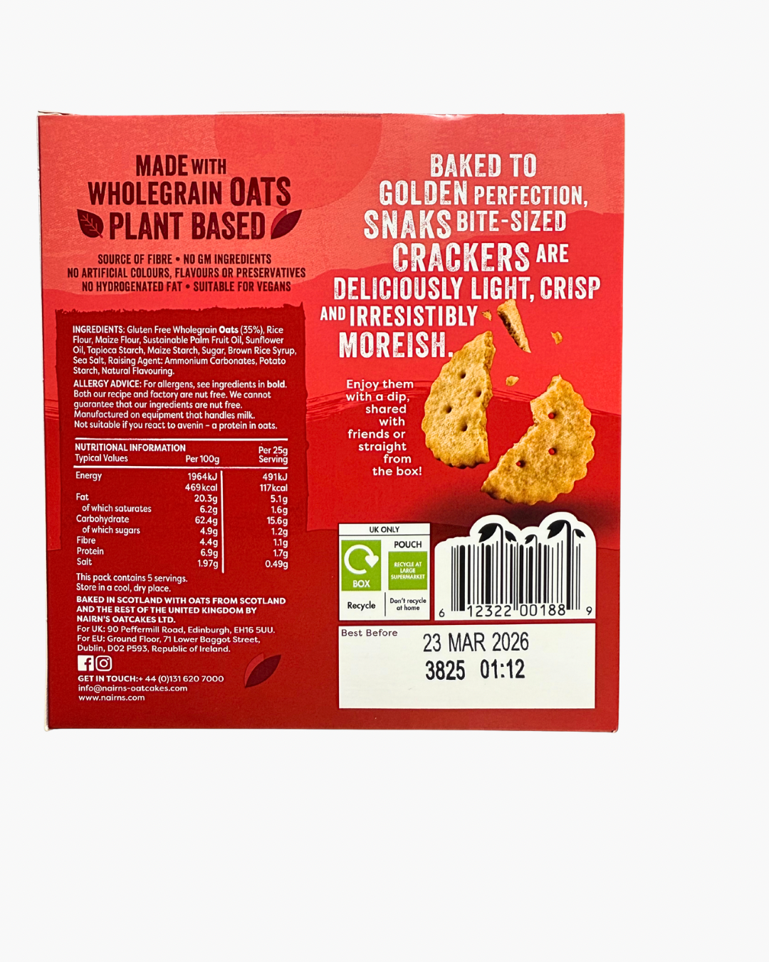 Satisfy your snack cravings with Nairn’s Snaks Salted Crackers. These crisp, lightly salted crackers deliver a deliciously simple taste and satisfying crunch, making them perfect for everyday snacking. Crafted with quality ingredients and designed for convenience, they pair effortlessly with dips, cheese, spreads, or even enjoyed straight from the pack.