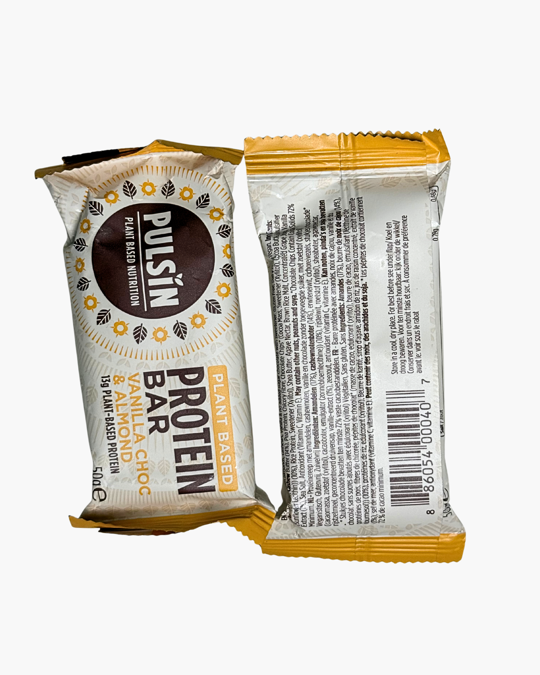 The Pulsin Vanilla Chocolate and Almond Protein Bar blends smooth vanilla, rich chocolate, and crunchy almond pieces into a convenient, satisfying snack designed for everyday energy and balanced nutrition.