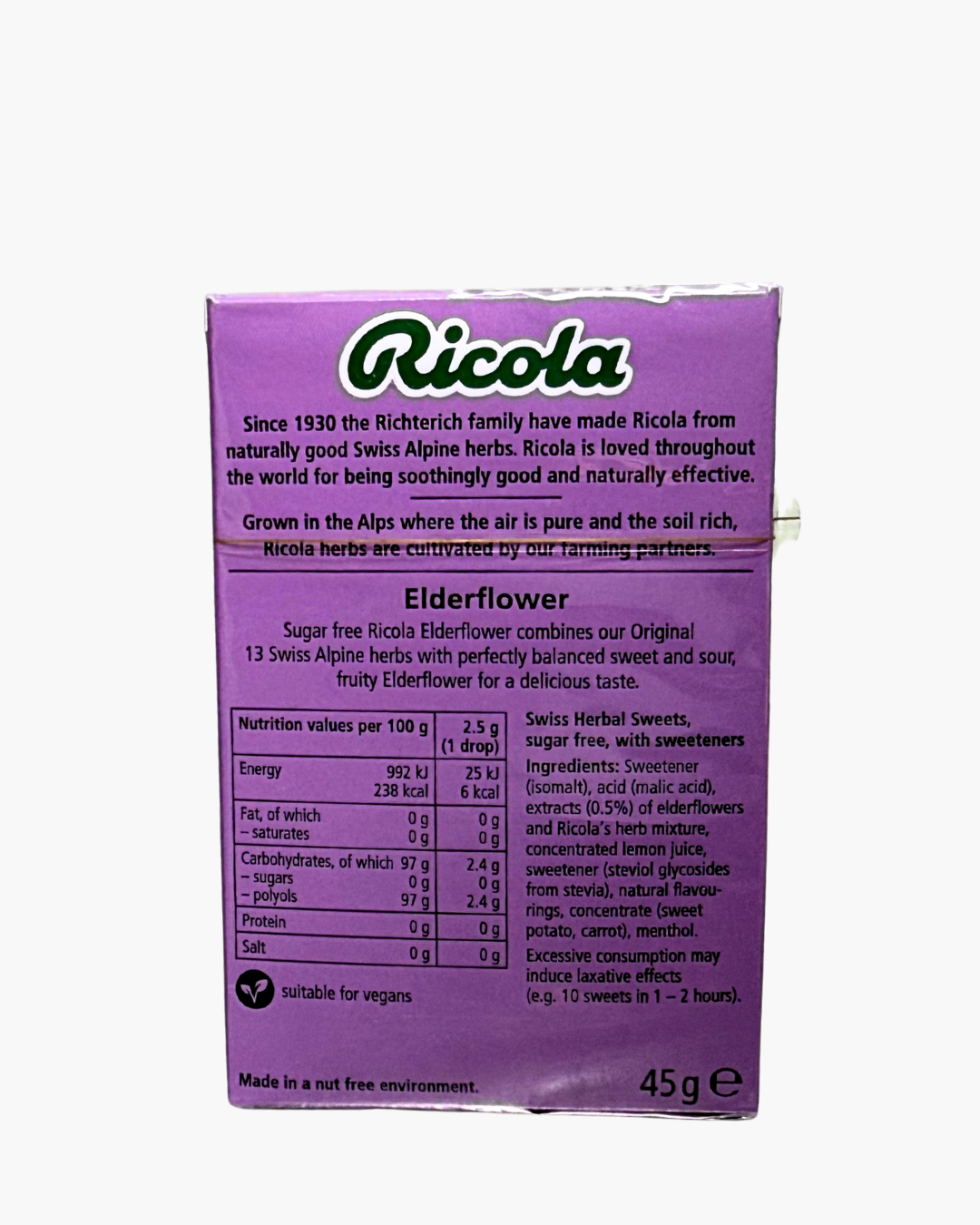 Ricola Elderflower Sugar Free Sweets offer a beautifully balanced flavour, combining the light, floral notes of elderflower with Ricola’s renowned blend of 13 Swiss Alpine herbs.